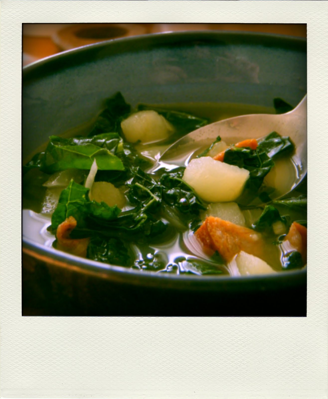 I know this is an awfully wintry, hearty sounding soup to be presented to you here in the middle of May, but our weather is being a little uncooperative and finicky. In defense of this soup, however, the kale was newly harvested from D's mom's garden. Sweet, meaty lacinato kale, that nutrient packed darling of the cabbage family; I could eat it every day. Did you see I threw some in my miso soup as well? When I brought the bag of kale home (a grocery bag at least half way full) I had grand plans. First I'd make this soup, as it was recommended by the grower herself, and with the leftovers I'd make a batch of kale chips. Pipe dreams. I though surely, staring at this pile of greens, there was well over a pound to distribute between the two recipes, but I would be wrong. Pulling out my digital kitchen scale I leaned my haul was merely 3/4 of a pound. Next time kale chips, next time.